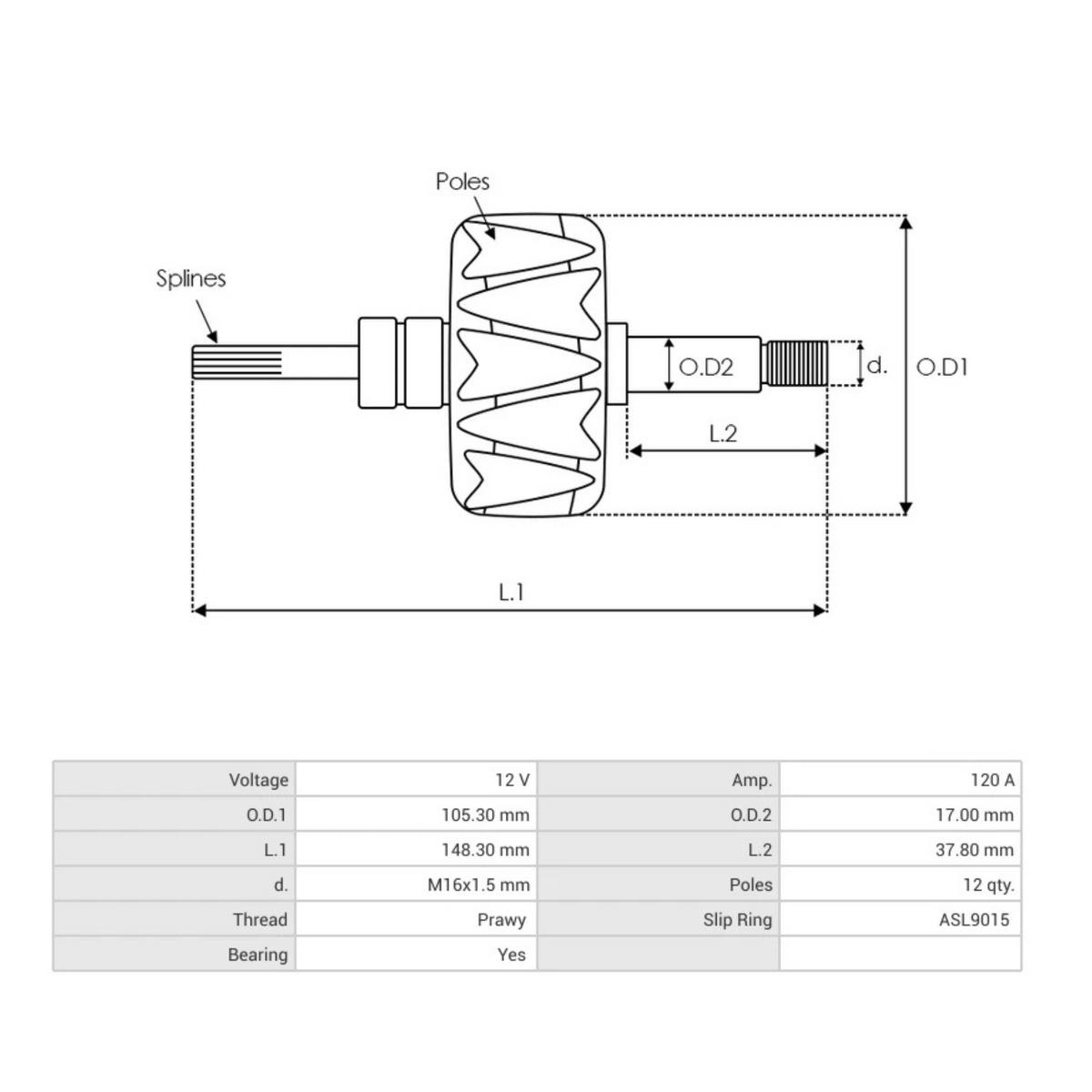 L.1 148.30, L.2 37.80, d. M16x1.5, Poles 12